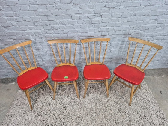 Vintage Design Set of Four Spindle-Back Kitchen Chairs – Beech Wood with Red Leatherette Upholstery, Northern Europe, 1960s