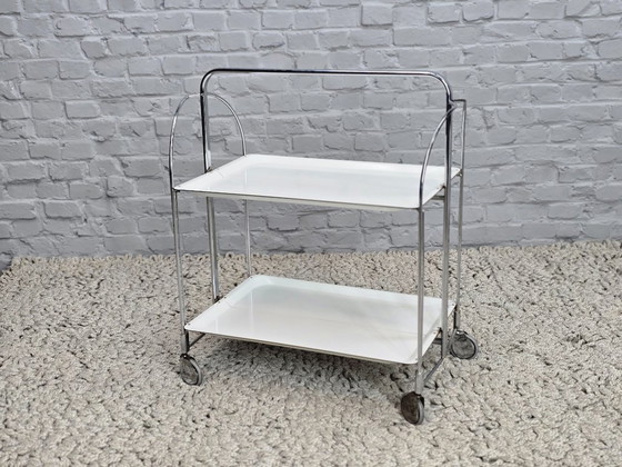 Vintage Foldable and Mobile Chrome Steel ‘Dinett’ Serving Trolley with 2 White Layers by Gerlinol, Germany, 1970s. This elegant and highly functional serving trolley features a chrome-plated tubular steel frame combined with 2 layers of white laminated surfaces, characteristic of practical German design from the 1970s. This variant is relatively rare.