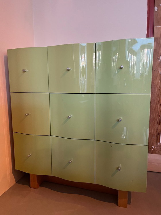 Commode ondulée verte avec un piètement en bois, des façades de tiroirs en plastique rigide et des poignées en aluminium. Un petit éclat dans le bois, visible sur la dernière photo, a été réparé. Commode vintage IKEA Vajer par Tomas Jellinek. Design intemporel et minimaliste. Solide et de belle facture. En bon état vintage.