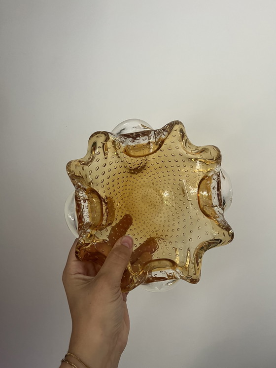 Ce cendrier vintage de Murano présente une étonnante couleur jaune ambrée avec une texture en nid d'abeille, mettant en valeur l'artisanat exquis du verre de Murano. Sa forme unique et sa teinte vibrante en font une pièce décorative parfaite pour n'importe quelle pièce. Idéal pour les collectionneurs ou comme pièce d'apparat, ce cendrier incarne l'élégance et l'art du design vintage de Murano.