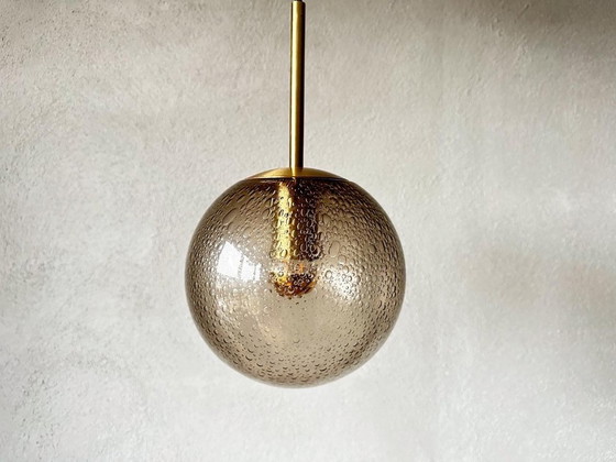 Magnifique design du milieu du siècle. Suspension fabriquée par la marque allemande Peill & Putzler dans les années 1970. Globe en verre bullé fumé avec suspension en laiton. En bon état vintage. Verre impeccable, le laiton présente quelques taches.