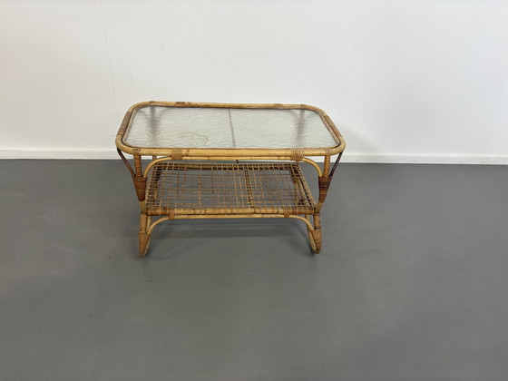 Plongez dans l'élégance des années 60 avec cette exquise table vintage en rotin, surmontée d'un plateau en verre nuageux. Cette pièce incarne le charme et le savoir-faire du design du milieu du siècle, alliant fonctionnalité et esthétique.