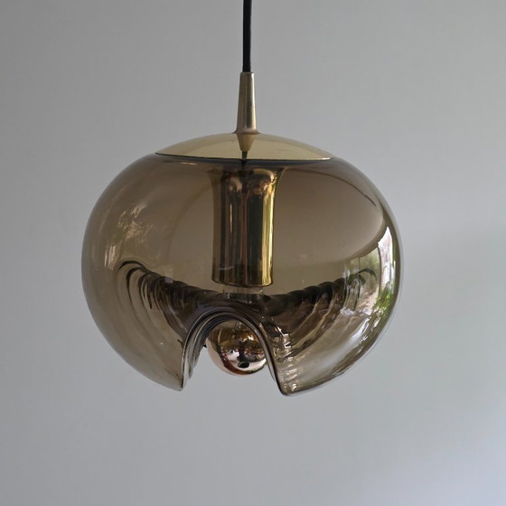 Vintage Space Age hanglamp – Peill & Putzler “Wave” / “Futura” – 1970s Duitsland – Rookglas en Metaal – Ø 26 cm. Goud.