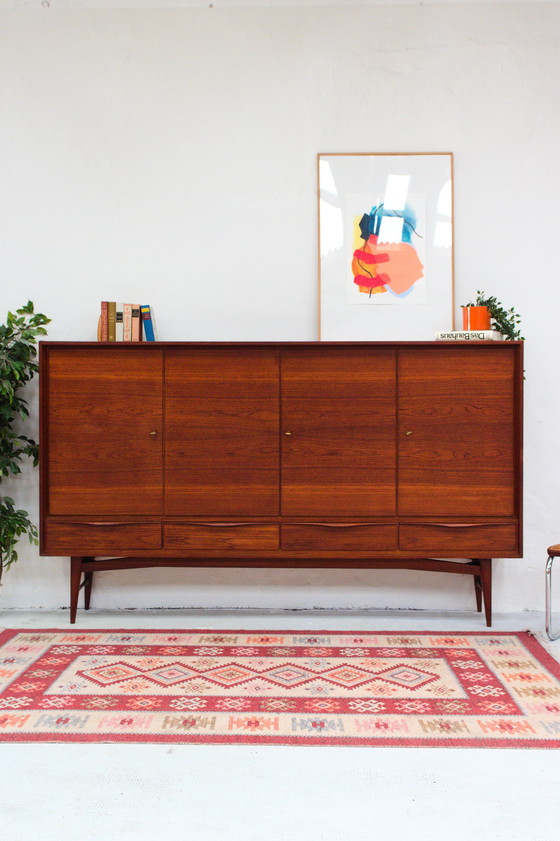 Un magnifique highboard danois en teck pour tes quatre murs. Grâce aux grands éléments de rangement et aux tiroirs, l'armoire t'offre beaucoup d'espace de rangement. Il a été conçu avec un grand souci du détail. Le teck crée une ambiance agréable et offre un superbe contraste avec un intérieur moderne. Des traces d'usure dues à l'âge sont présentes sur la partie supérieure.