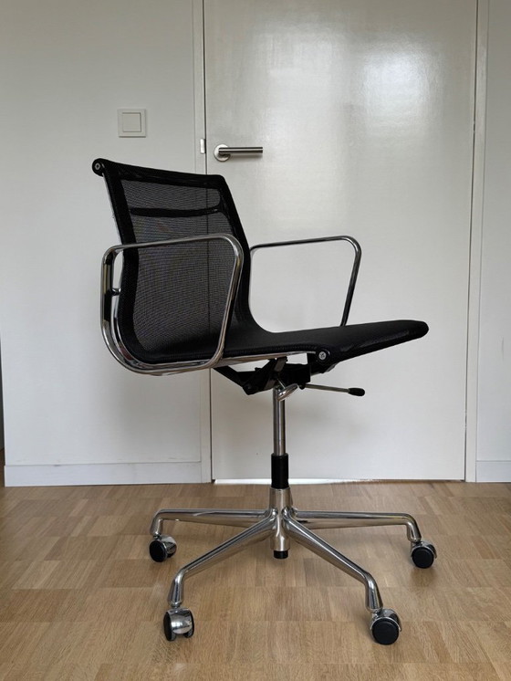 Cette élégante chaise de bureau Vitra Eames EA 117, conçue par Charles et Ray Eames, est recouverte d'un revêtement en maille noire et dotée d'une structure en aluminium chromé. La chaise est pivotante et inclinable et peut être réglée en fonction des préférences personnelles. Associée à une conception ergonomique, cette chaise convient parfaitement à une utilisation à long terme. Le design intemporel et la finition de haute qualité font de cette chaise de bureau un choix élégant et durable pour tout lieu de travail. La chaise de bureau est 100% originale et comporte toutes les caractéristiques d'authenticité. Ce modèle ressemble au EA108 ou EA119 et n'est pas non plus en cuir mais en maille.