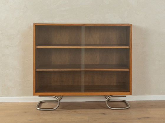 Magnifique vitrine des années 1950. Corpus en placage de noyer avec deux portes coulissantes en verre, deux étagères et de nouveaux pieds en acier au design Bauhaus. Fabriqué en Allemagne. Ref 2501055