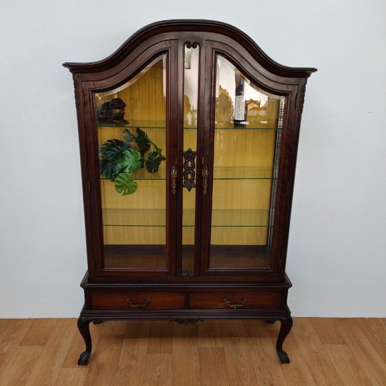 Sublimez votre intérieur avec cette magnifique vitrine ancienne de style Chippendale ! Composée de deux parties, cette vitrine se compose d'un socle avec deux tiroirs et d'une partie supérieure avec portes vitrées munies de serrures fonctionnelles et trois étagères en verre réglables en hauteur. Le panneau arrière est recouvert d'un tissu jaune ancien. Fabriqué en chêne massif, ce meuble date du début du XXe siècle et témoigne d'un savoir-faire exceptionnel. Derrière les portes vitrées, votre vaisselle ou vos collections restent à l'abri de la poussière et sont mises en valeur avec élégance. La partie inférieure offre un grand espace de rangement grâce à ses robustes tiroirs en bois. Admirez les fines sculptures sur bois et les ferrures authentiques qui ornent les portes. La patine subtile et le grain naturel du bois confèrent à cette vitrine un charme vintage unique. Utilisez-la comme pièce maîtresse dans votre salon ou comme garde-manger original dans votre cuisine. Un classique intemporel chargé d'histoire ! L'ancien propriétaire a percé un trou dans le coin supérieur droit, probablement pour une petite lampe. Une photo nette de ce trou a été prise. Dimensions