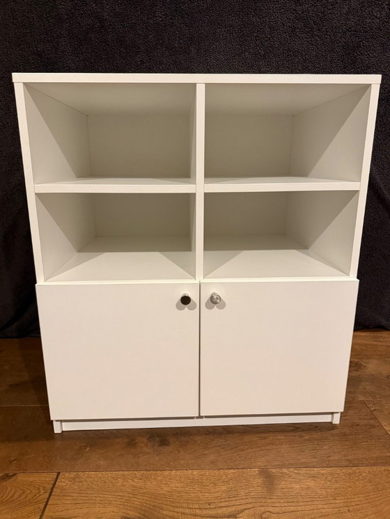 Ce meuble soigné possède des compartiments fixes. Les portes ferment bien et sont réglables. Le plan de travail présente quelques rayures. Le panneau arrière est coulissant et s'insère dans une rainure.