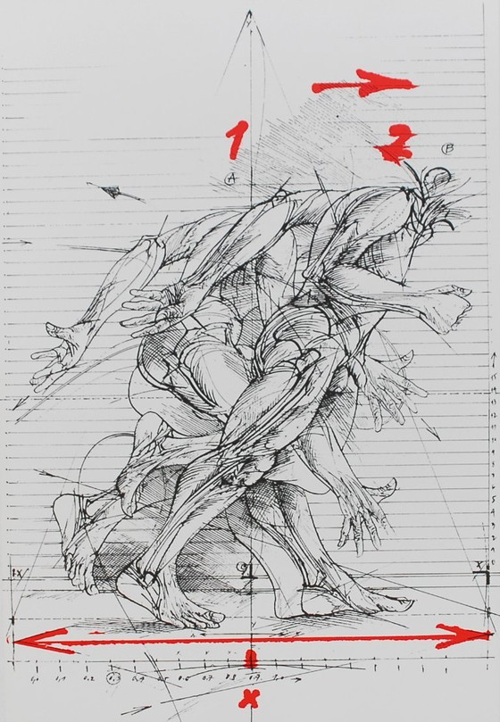 « Motion Sketch » est une sérigraphie de 1980 de Vladimir Veličković, artiste reconnu pour ses œuvres figuratives puissantes et expressives. La composition présente une figure humaine dynamique et anatomiquement complexe en mouvement, sur laquelle se superposent des lignes directionnelles et des annotations graphiques qui soulignent la tension, le mouvement et la construction spatiale. Caractéristique du langage visuel intense de Veličković, l’œuvre allie une énergie brute à une précision de dessin remarquable. Cette pièce offre une exploration fascinante du corps humain et du mouvement au sein d’un cadre structuré, presque scientifique.