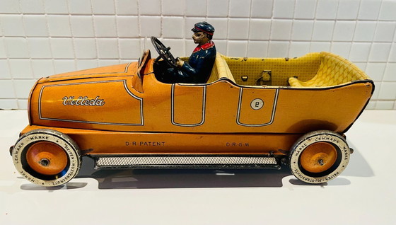 Rare modèle « Velleda » n° 730, fabrication allemande (probablement années 1910/1920), attribuable à la célèbre entreprise Lehmann. Voiture miniature en tôle décorée par lithographie, avec figurine de conducteur et mécanisme à ressort.
