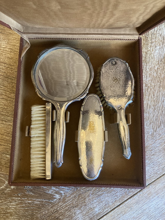 Magnifique ensemble de coiffure Art nouveau ou début Art déco avec son étui d'origine. Poinçon de Wilhelm Wolff sur la brosse et la brosse à vêtements ; absent sur le miroir, mais cohérent avec le style. Décor martelé, argenture patinée. La brosse à vêtements étroite est d'un modèle différent.