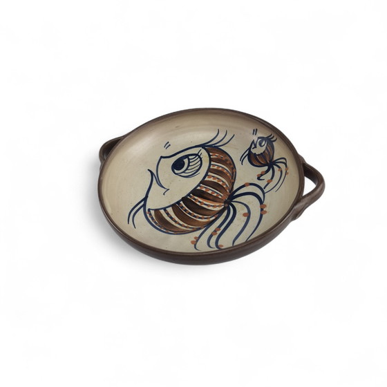 Cette assiette en céramique fabriquée à la main par Willer Keramik se distingue par son design exceptionnel dans le style des années 1960. Le motif central représente un couple de poissons peints avec art dans des tons vifs de bleu, de brun et d'orange sur un fond crème. Les traits de pinceau caractéristiques et pleins d'élan ainsi que la représentation stylisée charmante confèrent à l'assiette un caractère unique, presque expressif. Avec ses poignées latérales, cette pièce convient aussi bien comme plat de service que comme élément décoratif. Une véritable pièce maîtresse pour les collectionneurs de céramiques Mid Century et les amateurs d'artisanat unique.