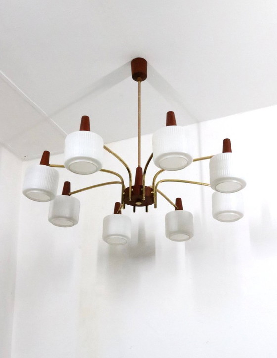 Ce lustre vintage de style design danois a une très grande taille et 8 sources de lumière. La lampe suspendue est faite de laiton, de bois de teck et d'abat-jour en verre de lait blanc. La lampe date des années 1960 et a été produite au Danemark/Scandinavie ou en Allemagne de l'Est.