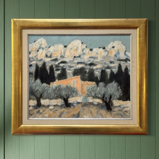 La scène se déploie dans des tons harmonieux et équilibrés : la maison s'illumine de tons chauds pêche et abricot, rehaussés par des volets turquoise et un portail bleu tendre. Des oliviers encadrent le premier plan de leur feuillage vert argenté, leurs racines ancrées dans le sol ocre, tandis qu'en arrière-plan, les collines calcaires pâles des Alpilles s'élèvent sous un ciel provençal limpide. Le coup de pinceau, ample et expressif, confère à la surface un rythme tactile qui fait écho aux textures naturelles du paysage.