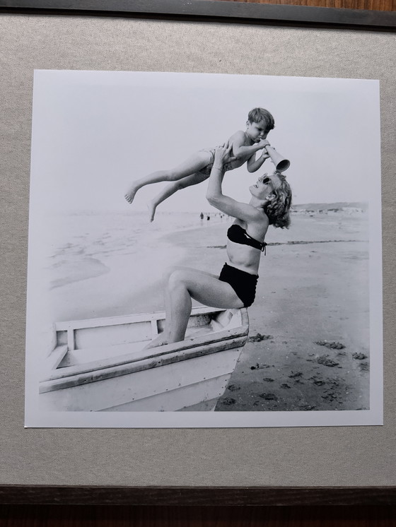 Tirage d'art de haute qualité représentant une scène de plage estivale à Zandvoort, daté du 24 juin 1953. Une mère hisse son enfant hors d'une barque à l'aide d'un klaxon. Un moment intemporel et émouvant de l'été néerlandais de l'après-guerre. Un précieux témoignage du patrimoine des Pays-Bas.