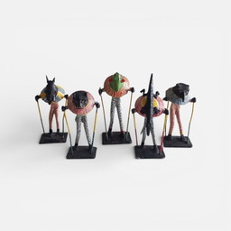 Ensemble de cinq statues figuratives africaines en métal peint à la main – têtes d'animaux – AfriqueEnsemble de cinq statues figuratives africaines en métal peint à la main – têtes d'animaux – Afrique