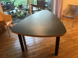Table à rallonge Arco graphic avec plateau en bois et pieds en aluminium.