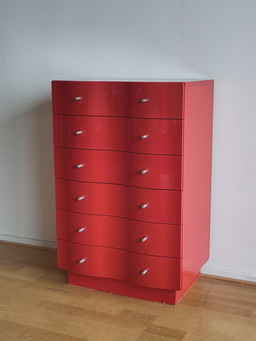 Vintage chest of drawers with red-pink plastic drawers 1970