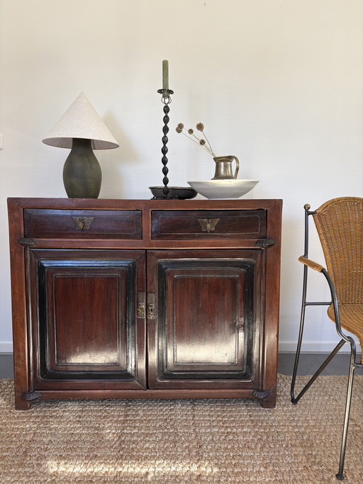 Antique Chinese cabinet in black and red lacquered wood – hand-painted