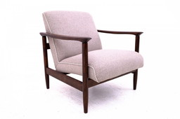 Vintage armchair, after renovation, beige upholstery, dark walnut color wood, Scandinavian design