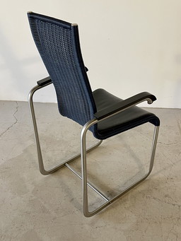 Vintage replica design chair with harness leather and tubular frame – in fair condition