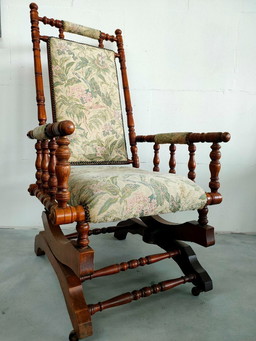 Late 19th century Victorian era wooden rocking chair with original floral upholstery.
