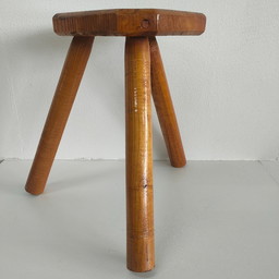 Tripod stool wood stained vintage design brutaliste popular France 1950s