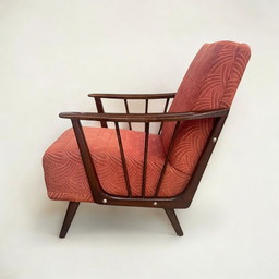 Vintage cocktail/lounge chair with walnut armrests and original red fabric cover. Classic from the 1950s / 60s