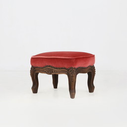 Baroque style foot stool in carved wood with coral velvet upholsteryBaroque style foot stool in carved wood with coral velvet upholstery
