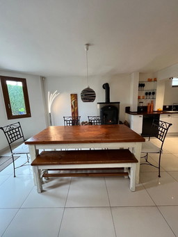 In the evening during dinner, everyone gathers in the dining room where it is often equipped with a dining table and chairs, which is neatly set for the whole family. The dining room set features a dining table with chairs.