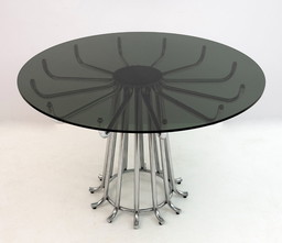 Round vintage dining table in smoked glass and chromed metal in the Space Age style of the 70s