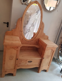 ##Dressing table with mirror For those who pay a lot of attention to make-up or like to look at themselves in the mirror, the dressing table with mirror is ideal! Whoppah features second-hand dressing tables with large or small mirrors, with or without frames, wide or high mirrors, round or square. You will also find dressing tables with drawers and shelves at Whoppah. The latter models are particularly popular as they offer even more storage space for your make-up products. The dressing table can also be used to store all kinds of utensils, such as cosmetics, perfume, hair clips, hair bands and much more.