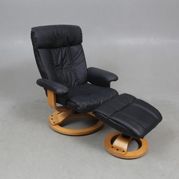 Sweden-origin Scandinavian lounge armchair with a matching ottoman, featuring a black leather and wood frame, in good condition