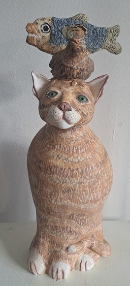 Scultura in ceramica di un gatto con compagni di gioco