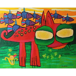 Grande dipinto di Paul Megens intitolato "Il mangiatore di ponti di Phnom Penh"