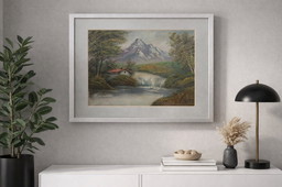 Dipinto di paesaggio montano d'epoca - Scena di cascata e baita incorniciata
