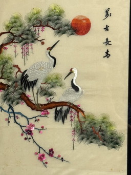 Pannello ricamato giapponese con gru, fiori di ciliegio e sole nascente, XX secolo.Pannello ricamato giapponese con gru, fiori di ciliegio e sole nascente, XX secolo.