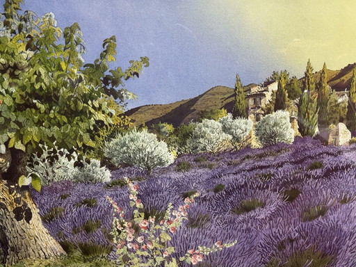 'Campi di lavanda in Provenza' di D. Broussie, serigrafia, Francia, fine del XX secolo'Campi di lavanda in Provenza' di D. Broussie, serigrafia, Francia, fine del XX secolo