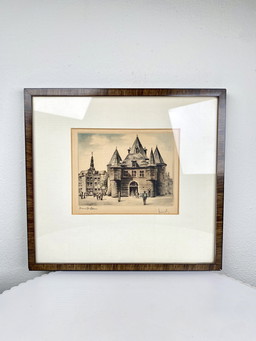 Piccola stampa artistica vintage di De Waag, Amsterdam / Nieuwmarkt in cornice vintage in legno - opera d'arte tradizionale