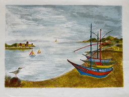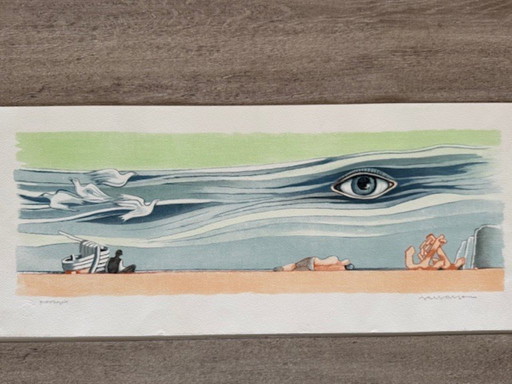 Teuber, Hermann - Senza titolo (Sedie da spiaggia) - Linoleografia a colori - Firmato a mano