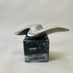 Scultura astratta in pietra ollare su base di marmo neroScultura astratta in pietra ollare su base di marmo nero