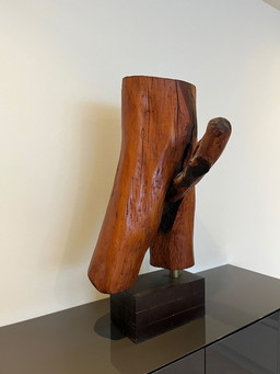 Scultura astratta brutalista intagliata, anni '70, legno e metallo