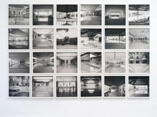 Pannello fotografico in bianco e nero composto da 24 pezzi raffigurante l'architettura di una piscina.