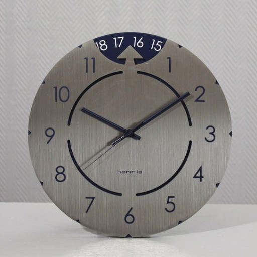Orologio da parete Hermle vintage con datario in design postmoderno in alluminio, anni '80Orologio da parete Hermle vintage con datario in design postmoderno in alluminio, anni '80