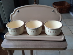 Antico porta sabbia, sapone e bibita in smaltoAntico porta sabbia, sapone e bibita in smalto