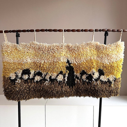 Vintage Wandteppich . Leibfried Rya Color . 70er . Mid Century . Handgearbeitet . Wolle . Hirte . Schafe . Befestigungsstab HolzVintage Wandteppich . Leibfried Rya Color . 70er . Mid Century . Handgearbeitet . Wolle . Hirte . Schafe . Befestigungsstab Holz