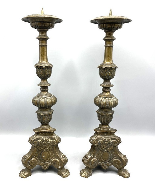 Set di due antichi candelieri in ottone o bronzo | Portacandele religiosi con motivi di santi | XIX/XX secolo