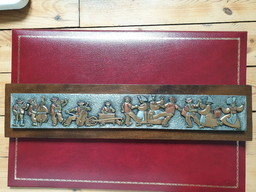 Fregio in rame raffigurante una festa di paese, in ottone e metallo argentato, firmato, realizzato a mano, pezzo unico.Fregio in rame raffigurante una festa di paese, in ottone e metallo argentato, firmato, realizzato a mano, pezzo unico.
