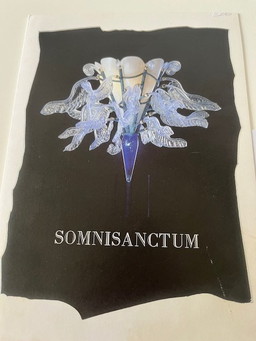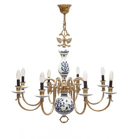 Lampadario in ottone con conchiglie e calici in vetro smerigliato