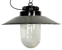 Lampada a sospensione in ghisa e smalto grigio industriale con copertura in vetro, anni '60